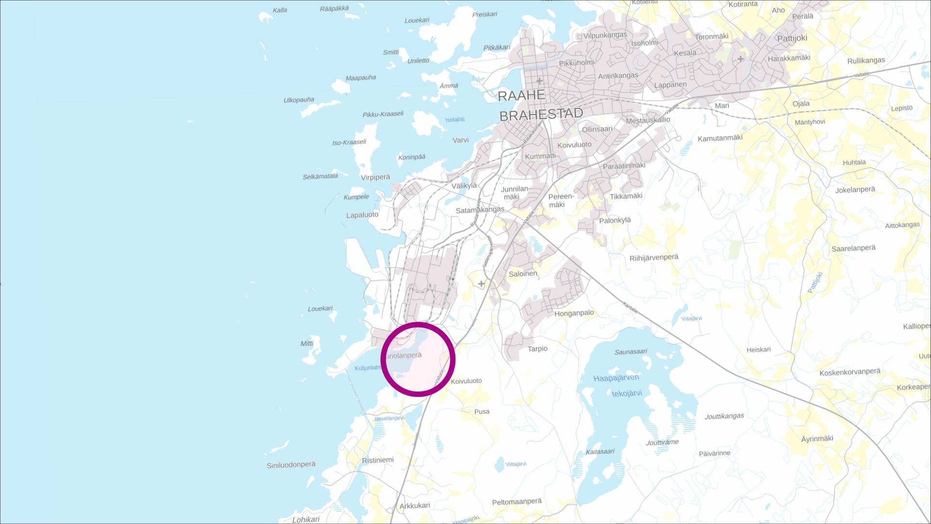 Sijainti SSAB:n tehdasalueen eteläpuolella, lähellä Raahen satamaa.